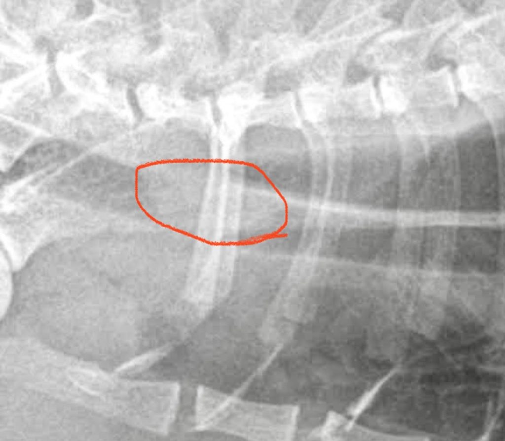 レントゲン画像。赤丸の中の白い部分が気管内に発生した腫瘍